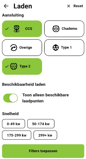 In de app van Travelcard kun je eenvoudig instellen welke laadstekker op de laadstations aanwezig is. (Zie onderstaande afbeelding).