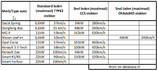 Hoe snel je kunt laden is afhankelijk van de laadpaal EN van de auto. Onderstaand een kort overzicht van de verschillende voertuigen.